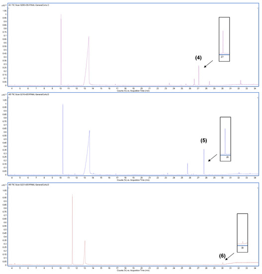 Chromatograms obtained via GC-MS of the enzymatic reaction products, obtaining (4), (5) and (6).