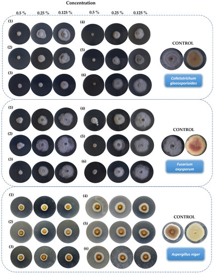 Colletotrichum gloeosporioides, Fusarium oxysporum, and Aspergillus niger mycelial growth inhibition effects exerted by hybrids: (1) 2-Isopropyl-5-methylphenyl benzoate, (2) 5-Isopropyl-2-methylphenyl benzoate, (3) 4-Allyl-2-methoxyphenyl benzoate, (4) 2-Isopropyl-5-methylphenyl cinnamate, (5) 5-Isopropyl-2-methylphenyl cinnamate, (6) 4-Allyl-2-methoxyphenyl cinnamate. Only one replicate per treatment and concentration is shown. Obverse and reverse of control treatment are shown.