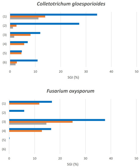 Figure 8 contains a graphical depiction of the SGI results obtained for the hybrids to enable easier interpretation. As shown, for C. gloeosporioides, all hybrids displayed medium efficacy at 0.5% and the benzoic esters performed the best. For F. oxysporum, all hybrids exhibited medium to low activity at higher tested concentrations, with (1), (3), and (4) being the best candidates. In the case of A. niger, the SGI results are not shown in the graph because only (1) and (2) exerted low efficacies, and the other hybrids appeared to be completely ineffective in inhibiting spore germination. Most hybrids did not present dose-dependent response behavior in the SGI assays conducted in this study.