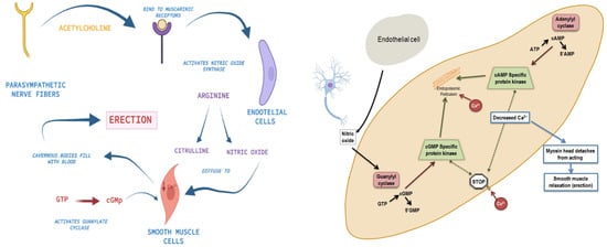Erectile dysfunction (ED), defined as the inability to initiate or maintain an erection satisfactory for sexual intercourse, is the most prevalent male sexual disorder [1]. An estimated prevalence of 50% among men between the ages of 40 and 70 is generally accepted, with almost 15% of patients reporting complete ED and the rest experiencing any degree of ED [2]. The increase in the modifiable risk factors for ED, such as cardiovascular disease, atherosclerosis, metabolic syndrome, diabetes mellitus or prostate cancer, has led to an increase in its prevalence in recent years [3]. Excluding ED of psychogenic origin, organic DE is the result of physical damage to vascular, endocrine, neurologic and anatomical structures, all of which comprise an intricate network of structural pathways which require the integration of signals from nerves, cavernous muscle and endothelium to produce a penile erection [2]. A diagram of biochemical signaling at a cellular level during erection and the pathophysiology of ED is depicted in Figure 1.