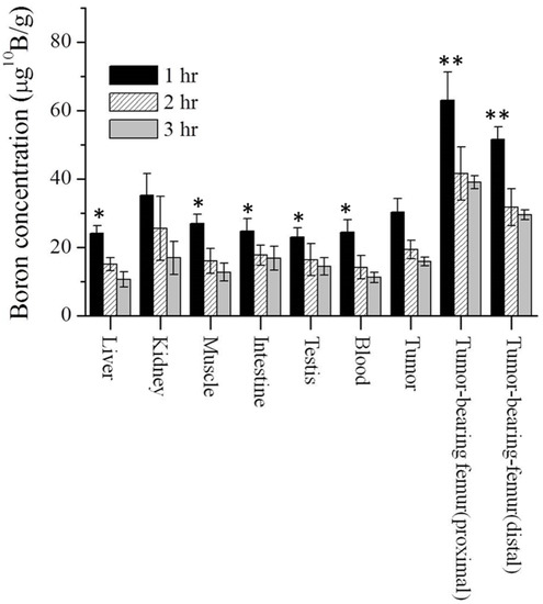 Rats were intravenously bolus-injected with BA (25 mg 10B/kg BW) via the tail vein, and sacrificed at 1, 2 or 3 h after BA injection. Liver, kidney, muscle, intestine, testis, blood, and tumor samples were collected. The samples were weighed and then digested using a microwave digestion system for the subsequent measurement of boron concentration in the tissues, using ICP-AES.