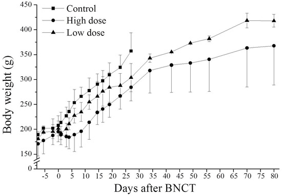 Body weight of OS-bearing rats within 80 days following BNCT. In the high-dose BNCT group, the tumor regions of OS-bearing rats received a dose of 11.0 Gy; and in the low-dose BNCT group, the tumor regions of OS-bearing rats received a dose of 5.8 Gy. Each point represents the mean ± SD (n = 3–5).