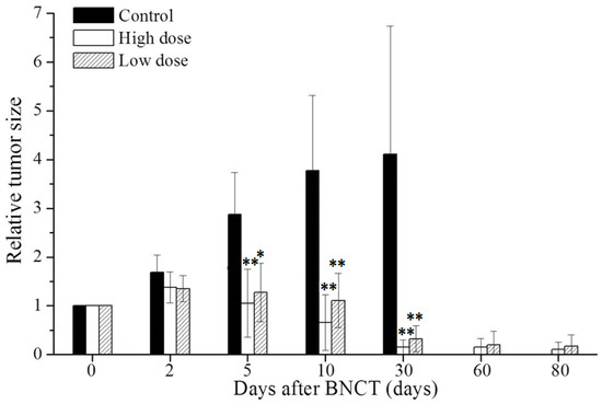 Relative extraskeletal tumor areas before and after BNCT treatment in OS-bearing rats. In the high-dose BNCT group, the extraskeletal tumor regions received a dose of 11.0 Gy; and in the low-dose BNCT group, the tumor regions received a dose of 5.8 Gy. The tumor region was traced using radiography within 80 days after BNCT. The relative tumor size was calculated as the tumor area after BNCT, divided by the tumor area on the day of BNCT. Each bar represents the mean ± SD (n = 3–5, ** p < 0.01 relative to controls, * p < 0.05 relative to controls).