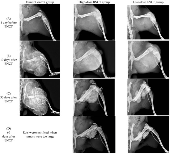 Radiographic investigation of BA-mediated BNCT rats. Radiographs taken of rats in the high-dose BNCT group and the low-dose BNCT group were obtained on the day before BNCT and the 10th, 30th, 60th, and 80th days after BNCT, respectively. The OS-bearing rats in the tumor control group were sacrificed and data were collected until day 30.