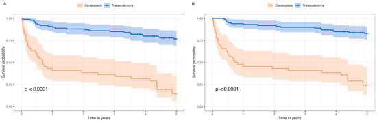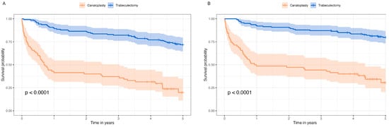 Strict surgical success was achieved in 14/70 subjects (20.0%) for modified canaloplasty and in 79/140 (56.4%) subjects for trabeculectomy after a median follow-up time of 4.6 [IQR 4.3, 5.05] years for modified canaloplasty and 5.8 [IQR 5.4, 6.3] for trabeculectomy (p < 0.001). Complete success was attained in 17/70 (24.3%) cases versus 93/140 (66.4%) cases (p < 0.001) and qualified success was seen in 24/70 (34.3%) cases versus 103/140 (73.6%) cases (p < 0.001).