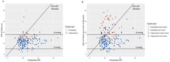 If—in case a revision surgery was conducted—IOP prior to the first revision surgery instead of IOP at last follow-up was taken into account (i.e., IOP either prior to the first revision surgery or at last follow-up in case of absence of revision surgeries, with or without AGM), the mean IOP was 19.9 ± 9.4 mmHg after modified canaloplasty versus 13.3 ± 6.3 mmHg after trabeculectomy (p < 0.001). Figure 2B displays IOP either at the last follow-up (bright brown for canaloplasty, bright blue for trabeculectomy) or prior to revision surgery (dark brown for canaloplasty, dark blue for trabeculectomy), showing a high number of canaloplasty cases above the 18 mmHg and 20% IOP reduction threshold lines.