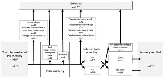 The study subjects were enrolled from the population of stroke subjects who were recruited within the PRESS study (pulse oximetric routine examination of sleep apnea in acute stroke), as previously described [14] (see flowchart in Figure 1).