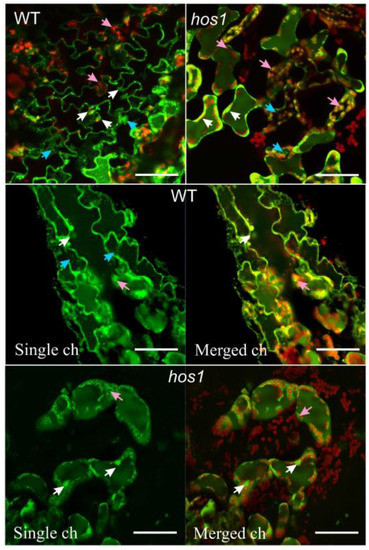 A representative view of ROS localization in epidermal cells of WT and hos1Cas9 plants. The upper panel shows cell images using two merged channels: the “ROS channel,” in which DCF fluorescence was measured at an excitation wavelength of 488 nm and detected at 505–530 nm, in combination with the “chloroplast channel.” The chloroplast channel represents chloroplast autofluorescence, which was recorded using an emission channel at 600 nm. Chloroplasts are visible as red organelles with green inclusions reflecting ROS localization. White arrows indicate ROS localization in the nucleus (green color), pink arrows indicate chloroplasts (red color), and blue arrows indicate vesicles with ROS (green color). Two bottom panels show images of WT and hos1Cas9 epidermal cells in a single ROS detection channel (left) and the same cells in merged ROS and chloroplast channels (on the right). The scale bars are 50 µm.