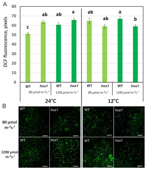 Although the combination of heat and intense light is more common in plant cultivation, the combination of cold and intense light is also important [22]. We proceeded from the assumption that HOS1 may be involved in the regulation of ROS metabolism, since ROS play an important role in both light and temperature adaptation [13,14,15,16,17]. Therefore, the purpose of this work was to study ROS production in WT and hos1Cas9 mutant Arabidopsis plants.