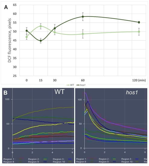 The basal level of ROS is necessary for normal plant development and maintaining the basal level of ROS below the cytotoxic level but above the cytostatic level is an important biological process [44,45]. In this work, we studied the effect of the hos1 mutation on ROS content in A. thaliana WT and hos1Cas9 mutant plants. Our goal was to attenuate the functioning of the pleiotropic regulator HOS1, which is required for adaptation of plant development to environmental temperature [1,2,3,4,5,6,7], and to see against this background if HOS1 manifests its effects through ROS modulation.