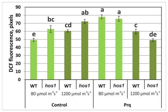 ROS levels in epidermal cells from the abaxial leaf side of WT and hos1Cas9 lines of A. thaliana plants treated with 10 μM paraquat under low and high light conditions. Data were obtained using confocal microscopy. The plants were loaded with H2DCF-DA, and the fluorescence of DCF was visualized by laser-scanning confocal microscopy under control conditions (24 °C/80 µmol m−2 s−1) and high light (24 °C/1200 µmol m−2 s−1 for 2 h). ROS levels are presented as the mean ± SE from three independent experiments. Different letters above the bars indicate significantly different means (p < 0.05; Fisher’s LSD).