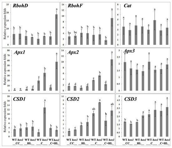 Expression of Rboh genes and genes encoding ROS-detoxifying enzymes in WT and hos1Cas9 plants. The genes encoding ROS-detoxifying enzymes are presented by superoxide dismutase (SOD, CSD1-3), ascorbate peroxidase (APX1-3), and catalase (Cat1). Data are presented as the mean ± SE from the analysis of two different experiments with three technical replicates. Different letters above the bars indicate significantly different means (p < 0.05; Fisher’s LSD). CC, control conditions (24 °C/80 µmol m−2 s−1); HL, high light (24 °C/1200 µmol m−2 s−1 for 2 h); C, cold conditions (12 °C for 24 h/80 µmol m−2 s−1); C + HL, cold and high light conditions (12 °C for 24 h, followed by 1200 µmol m−2 s−1 for 2 h).