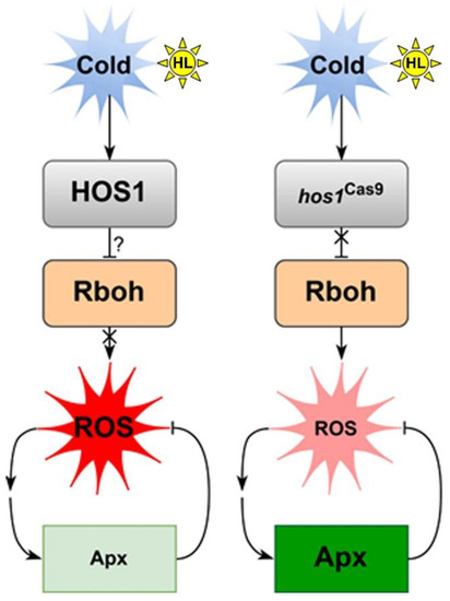 It is clear that the influence of the HOS1 gene on ROS can be associated with various regulatory mechanisms, including both ABA signaling and cues from the light signaling system. The most promising for further study are the regulatory modules HOS1—‖ICE1—‖ABI5→RbohD/F and HOS1—‖PIF4→ABI5→RbohD/F, which may have an overlap in ROS regulation via ABI5 function [48]. Similarly, the HOS1-RBOHD/F-ROS-ENO2-CBF signaling chain may explain how HOS1 activates plant cold response through ENOLASE2 (ENO2), given the recently discovered role of ENO2 in cold adaptation [49].