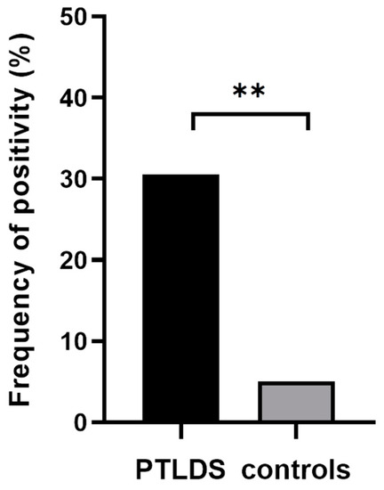 Comparison of the incidence of myositis autoantibodies in patients with suspected PTLDS (18/59) and control group (2/40). Indication of statistical significance: ** p < 0.01.