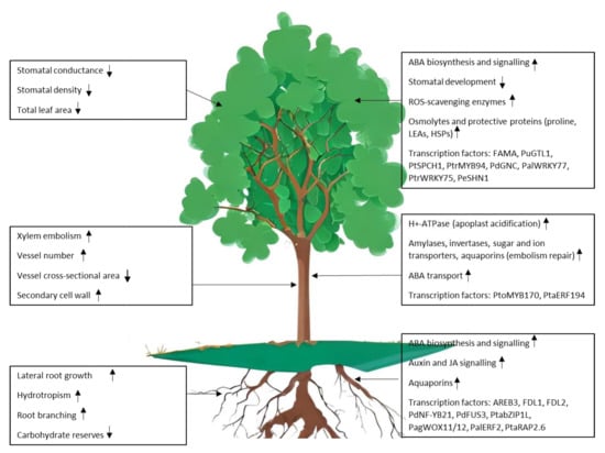 Drought-induced morphological modifications such as increased growth and hydrotropism are integrated by functional adaptations. For instance, the transcription factor PalERF2, an AP2/ERF transcription factor from P. alba var. pyramidalis, is upregulated by drought and promotes the expression of Pi transporters that improve Pi uptake under drought-stress conditions [98]. Furthermore, rerouting of gene expression patterns in roots under drought stress affects physiological adaptations at the whole plant level. Under mild drought, P. tremula × P. alba lines downregulated for the tonoplast sucrose transporter (SUT) PtaSUT4 displayed reduced shoot growth compared to the wild type. SUT4-RNAi plants displayed altered expression patterns that were more significant in root tips for genes encoding LEAs and for ABA-, ethylene (ET)-, and jasmonate (JA)-associated genes, and in stem xylem for aquaporin-encoding genes. These results suggest that the shoot/root sugar gradient mediated by PtaSUT4 affects the response of the whole plant to drought by modulating specific gene-expression patterns in different organs and tissues [99].