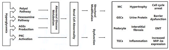 DN is a common complication of diabetes mellitus in which the structure and function of the kidneys are disturbed. It is also considered a glomerular disease. Persistent urinary protein (albumin excretion rate (AER) > 300 mg/24 h) in diabetic patients without other renal disease and urinary tract infection is defined as DN [1]. The pro-inflammatory and profibrotic effects lead to the apoptosis of mesangial and endothelial cells and, ultimately, to the disruption of the glomerular filtration barrier. Abnormalities in glomerular and tubular function occur almost simultaneously [2]. Hypertension, progressive proteinuria, glomerulosclerosis, and decreased glomerular filtration rate (GFR) are the main features of DN [3]. Poor blood glucose control in patients with chronic diabetes aggravates these major pathological features and produces structural changes in the kidney. The most common pathological changes in the glomerulus are telangiectasia, basement membrane thickness, extracellular matrix expansion, multicellular injury, and fibrosis [4]. According to the ultrastructural changes of glomeruli, the glomerular lesions of DN are divided into four stages: Grade I, thickening of glomerular basement membrane (GBM), which is characterized by ultrafiltration; Grade II, mild mesangial dilatation (IIa) or severe Mesangial dilatation (IIb); Grade III, tuberous sclerosis (Kimmelstiel-Wilson lesion); and Grade IV, advanced diabetic glomerulosclerosis with obvious albuminuria [5]. GBM occurs in the early stage of diabetes, and the extracellular matrix accumulates over time; the mesangial matrix thickens continuously, resulting in the diffuse expansion of the mesangial matrix, which is considered a landmark lesion of DN [6]. Diabetes affects all cell types of the kidney, including endothelial cells, tubular interstitial cells, podocytes, and mesangial cells [7]. The effects of high glucose, polyol pathway activation, hexosamine pathway activation, and other mechanisms lead to structural and functional abnormalities in various renal cells [8,9].