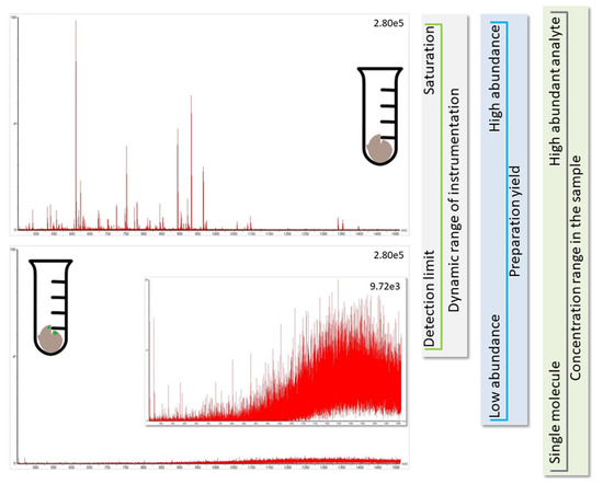 We currently observe an increasing separation of MS experiments and data analysis and an unfounded excessive trust in automation, which bears dangers regarding the quality of experimental results. This trend has been noticed for some time, and scientists have expressed the need for better control and validation of the results of proteomic analyses (see “Proteomics is analytical chemistry” [9,10], and “A critical review of bottom-up proteomics” [11]). The problem is that MS shotgun experiments produce spectra in a wide range from poor to high quality—from the detection limit of the instrumental setup to its saturation. Mass spectrometers themselves have a dynamic range of approximately four to five orders of magnitude, instrument-, method-, and molecule-depending. For example, for the orbitrap mass analyzer, 5-ppm mass accuracy was reached at a dynamic range of more than 5000, which is about an order of magnitude higher than typical values for time-of-flight instruments [12]. For electrospray instruments’ linear dynamic range, an upper analyte concentration limit of ~10−5 molar was reported [13]. In the case of MS imaging, a dynamic range per pixel over 500:1 was obtained from the analysis of tissue sections [14].