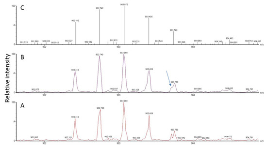MS signal for a triply-charged peptide detected at m/z 902.412 in the spectrum (A). Raw data (A) need to be smoothed (B) and centroided (C) for subsequent database search. A peptide peak is composed of several isotope peaks, which provide information about the analyte composition based on the natural abundance of individual isotopes in nature. Signals from other peptides may overlap (see arrow), which makes it difficult, depending on instrument resolution, to correctly determine masses, especially at low intensity.