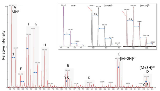 Exemplary electrospray ionization spectrum showing several peptide peaks. (A,E,G) Singly-charged; (B,C,F,K) doubly-charged; (D) triply-charged; (H) overlapping peaks hard to distinguish. Labels and peak distances on the isotope clusters visualize the charge. The inset shows for a singly- (MH+) and two doubly-charged ([M + 2H]2+) ions that with increasing peptide mass, the monoisotopic mass is not the largest signal of the isotope cluster anymore. The switch occurs at about 1900 Da.