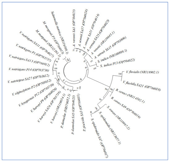 Sequence alignment was performed using BioEdit version 7.1.3.0 [20], and a total of 859 bp were successfully aligned in the final dataset consisting of 31 nucleotide sequences, including Salmonella enterica as the outgroup. The 16S rDNA sequences were subjected to a BLAST search to determine the sequence homology with the sequences previously deposited in the NCBI to identify isolated bacterial species and strains. The sequences with the highest homology belonging to Vagococcus fluvialis, Staphylococcus aureus, Staphylococcus epidermidis, Shewanella indica, Photobacterium damselae, Morganella morganii, Bacillus cereus, Aeromonas veronii, and Vibrio harveyi were added to our dataset to determine the relation of our isolates with them. A phylogenetic tree was generated by the neighbor-joining method [21] with a bootstrap test (1000 replicates) [22]. The Kimura two-parameter method [23], the best-fitting model for our sequence dataset, was used to compute the pairwise evolutionary distances among the sequences, with the gaps removed by the pairwise deletion option implemented in MEGA 11 software [24].