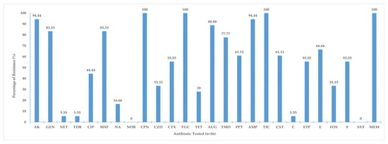 In addition, it is worth noting that Vibrio spp. (n = 9) were particularly completely resistant to ceftaroline, tigecycline, ticarcillin, colistin, and meropenem (Figure 3). On the other hand, these bacteria were found to be sensitive or dose-dependently resistant (intermediate) to netilmicin, norfloxacin, chloramphenicol, and trimethoprim–sulfamethoxazole. Similarly, the Aeromonas spp. (n = 5) strains were completely resistant to amikacin, moxifloxacin, ceftaroline, tigecycline, amoxicillin–clavulanic acid, ampicillin, ticarcillin, and meropenem. The lowest percentage of resistance was recorded with three antibiotics (tobramycin, norfloxacin, and trimethoprim–sulfamethoxazole) (Figure 3).