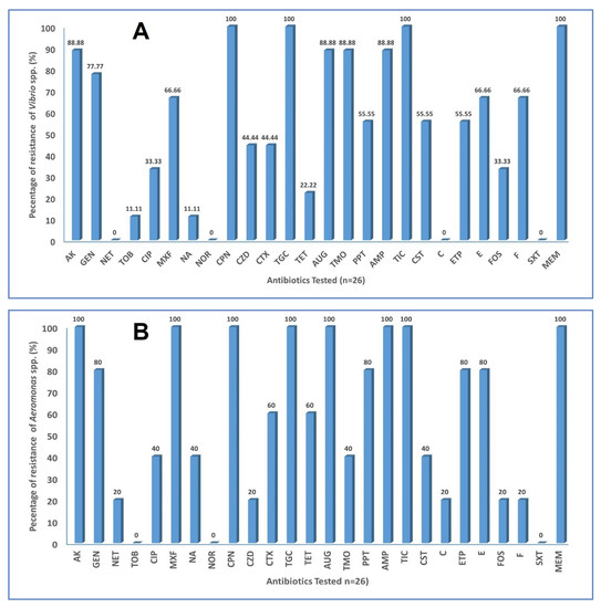 Percentage resistance of Vibrio spp. (A) and Aeromonas spp. (B) strains to the 26 antibiotics tested in this study.