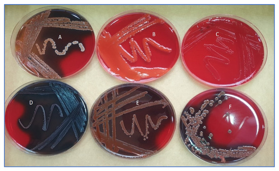 The identified isolates were tested for their abilities to produce several exoenzymes including DNAase, lipase, amylase, caseinase, and lecithinase, according to the protocol described by Hörmansdorfer et al. [25] and Snoussi et al. [26]. For the experiment, PBS agar medium was supplemented with Tween-80 (lipase activity), starch (amylase activity), skim milk powder (caseinase activity), and egg yolk (lecithinase production). Petri dishes were incubated for 72 h at 37 °C, and the formation of a clear zone around the inoculated spots was considered a positive test. In addition, hemolysin production was tested on human blood agar supplemented with 5% human blood (Oxoid Ltd., Basingstoke, UK) [26].