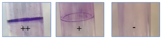 Pellicule formation on the surface of the tested glass tube stained with 1% crystal violet. (++): large pellicule formation; (+) weak pellicule formation; (−) no pellicule formation.