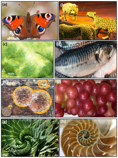 Patterns of COR in eukaryotic lifeforms. Circularly concentric spots in (a) butterfly and (b) felines. Equidistant to branching lines in (c) coral and (d) a fish. Twinned pattern in (e) fungus and (f) grapes. Spiral fractals in (g) cactus and (h) nautilus. Photos by D. Papineau.