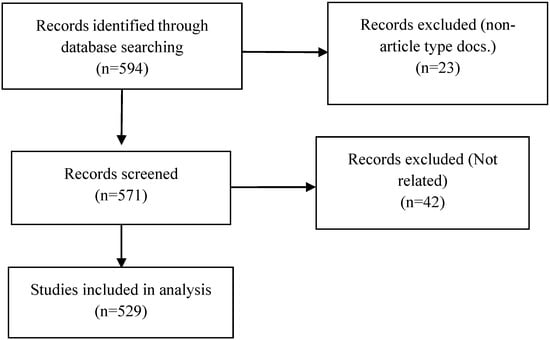 The specified search strategy was able to locate 529 documents in total from 267 sources, including journals, books, etc., published from 1981 to 2022. The average number of years from publication was 4.59 years. The average number of citations per document was 21.22, and the average number of citations per year per document was 3.759. The retrieved documents were original articles (n = 308), review articles (n = 138), notes (n = 33), editorials (n = 18), letters (n = 12), conference papers (n = 11), short surveys (n = 5), book chapters (n = 3), and other types of publications, such as errata (Table 2).