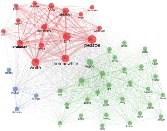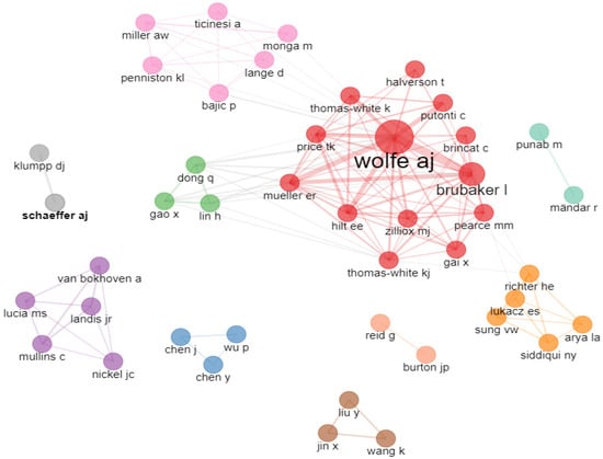 The authors with the most publications were Wolfe AJ and Brubaker I. Figure 2 shows the networks of author collaborations. The size of the nodes indicates the number of publications, while the thickness of the links shows the intensity of the collaborations.