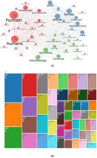 A study field’s hot spots and trends are indicated by keywords. Article keywords can provide essential details about the subject or the central thesis of a particular study [27]. The high-frequency keywords microbiology, microflora, microbiota, microbiome, urinary tract infection, gut flora, RNA 16s, lactobacillus, genetics, etc., were all given a typical overview by keyword co-occurrence analysis.