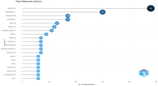 The most productive authors in the field of microbiomes in LUTSs were identified based on the statistical analysis of the chosen journal articles. The authors in this field with the most publications are shown in Figure 2.