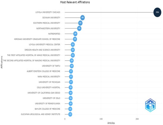 The most relevant affiliations are presented in Figure 8. According to the analysis, Loyola University Chicago was in the first rank, and Sichuan University and Southern Medical University were the other top universities in this field.