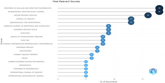Frontiers in Cellular and Infection Microbiology and the International Urogynecology Journal, followed by Nature Reviews Urology, were the top three most relevant sources in microbiome research in LUTSs, with 18, 18, and 16 published articles, respectively (Figure 9).