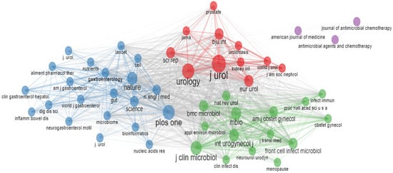 Figure 12 depicts the source co-citation network. The most prominent journals in this field, according to the scores, among 50 nodes, were the Journal of Urology, Urology, Nature, PLOS One, the Journal of Clinical Microbiology, the International Urogynecology Journal, and mBio.