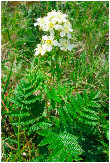 Conventional medicine currently takes advantage of only ~5% of all the species of higher plants that have been studied [6]. Nonetheless, poorly studied or unexplored plant species are a great potential source of new biologically active compounds [7]. One of these species is Sorbaria pallasii (G.Don) Pojark. [= S. grandiflora (Sweet) Maxim.]. It is a semi-shrub up to 50 cm high that belongs to the family Rosaceae Juss (Figure 1). Young shoots are brownish, glabrous, or finely pubescent with yellowish branched hairs, and older shoots have peeling bark. Leaves are imparipinnate, up to 15 cm long, of 9–15 pairs of leaflets, dark green, glabrous, or often pubescent. Flowers are in small obovate panicles and white, pinkish, or creamy white, up to 1.5 cm in diameter. Fruits are pubescent follicles with small seeds. The follicular fruit contains small seeds. The species grows along the alpine mountain belt, on bald mountains and stony slopes and placers, sometimes among thickets of dwarf pine. S. pallasii is endemic to Eastern Siberia and the Far East [8,9,10] and is included in the endangered species list (Red Book) of Magadan Oblast [11].
