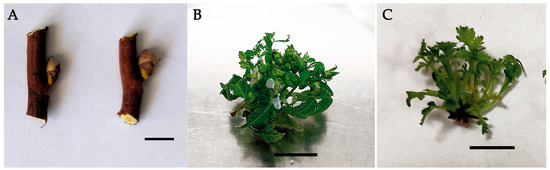 Surface sterilization of the plant material performed using HgCl2 and subsequent culturing of each explant (Figure 2A) resulted in a high yield (that reached 70%) of aseptic explants. Because S. pallasii was introduced into in vitro culture for the first time, the MS medium, the most common culture medium for this purpose, was used as a mineral base. BA and α-NAA (PGRs most commonly used for clonal micropropagation experiments) were utilized for the induction of morphogenesis [38,39,40,41,42]. After 2 weeks of the culturing, initiation of morphogenesis was observed, and a month later, a single 20-mm-high microshoot with flower buds and leaves developed from the explants (generative buds; Figure 2B). The frequency of regeneration of noncontaminated material reached 94%. Primary microshoots were shredded into pieces, including buds, leaves, and single-node stem segments. They were cultured for a month in the micropropagation medium: either MS plus 5.0 µM BA or MS plus 5.0 µM BA in combination with 1.0 µM α-NAA. During culturing of leaves and buds, no further morphogenesis was registered. Regeneration was observed only in single-node segments in culture media of both hormonal compositions (Figure 2C). In the medium with cytokinin (5.0 µM BA), the number of microshoots per explant was 5.7 ± 1.2, and in the medium with the cytokinin and auxin (5.0 µM BA and 1.0 µM α-NAA), it was slightly higher: 5.8 ± 1.4. The height of the microshoots on the medium containing BA was 9.3 ± 3.9 mm, and the number of leaves per microshoot was 4 ± 1. On the medium containing the auxin, the height of the microshoots was greater (10.8 ± 3.3), but the number of leaves was slightly lower (3.9 ± 0.9). Nevertheless, chlorosis was detected in the experiment with the medium containing the auxin and cytokinin. It should be noted that the choice of the PGR concentration, combination, and ratio for the preparation of the medium not only is species-specific but also depends on the genotype of the specimen under study.