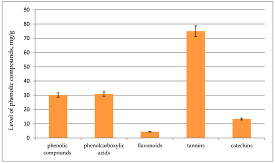 PCs are secondary metabolites synthesized in response to stressful conditions in order to perform some physiological functions in plants. They protect from ultraviolet (UV) radiation and predators and participate in plant growth and plant responses to environmental stressors, including an injury, a pathogen invasion, mineral deficiency, and temperature stress [46,47,48]. PCs are among the main compounds that impart antioxidant properties to plants [49]. Excessive production of free radicals in the human body can cause such illnesses as cancer, atherosclerosis, Alzheimer’s disease, Parkinson’s disease, and cerebrovascular and cardiovascular diseases. A number of studies have revealed a preventive effect of PCs against these diseases [49,50,51]. In vitro systems of cultivation of various plant species can be an alternative source of polyphenolic compounds having a strong antioxidant effect, even stronger than that of intact plants [52,53]. Here, we investigated concentrations of PCs in the water-ethanol extract of S. pallasii microshoots (Figure 3). The extract was found to contain phenolcarboxylic acids at 30.8 mg/(g of ADM), whereas the content of flavonols (4.3 mg/[g of ADM]) was modest: seven-fold lower than that of phenolcarboxylic acids. The highest concentration of tannins (74.9 mg/(g of ADM)) and a relatively high level of catechins (13.3 mg/(g of ADM)) were detected in microshoots. The total phenolic content determined by the Folin–Ciocalteu assay was 30.2 mg/(g of ADM).