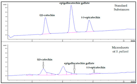 Catechins or flavan-3-ols belong to the flavonoid class. The catechin molecule contains two asymmetric carbon atoms on the pyran ring (C2 and C3), and hence each catechin can have four isomers and two racemates. A characteristic feature of catechins is the ability to accept a gallic acid residue with the formation of esters: gallates. Camelia sinensis and its in vitro cultures are a rich source of nongallated and gallated catechins, i.e., catechin gallates [46,54,55]. Individual catechins have been identified in representatives of the genus Sorbaria previously. For example, (±)-catechin and (−)-epicatechin have been detected in the above-ground part of S. sorbifolia var. Stellipa Maxim. [56] In our current work, based on the UV spectra and a comparison of retention times of peaks of substances in chromatograms of the analyzed samples with those of the standard samples, three catechins were identified in S. pallasii microshoots by HPLC: (±)-catechin (λmax = 280 nm; tR = 4.8 min), epigallocatechin gallate (λmax = 280 nm; tR = 6.5 min), and (−)-epicatechin (λmax = 280 nm; tR = 7.6 min; Figure 4). Quantification of the identified substances showed that the level of (±)-catechin (3.03 mg/(g of ADM)) was the highest in microshoots. Concentrations of epigallocatechin gallate (0.38 mg/(g of ADM)) and (−)-epicatechin (0.55 mg/[g of ADM]) were 8- and 6-fold lower, respectively, as compared to the content of (±)-catechin.