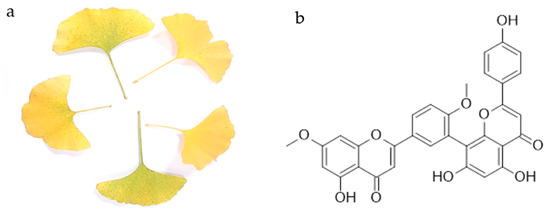 Yellow leaves of Ginkgo biloba L. (a) and the chemical structure of ginkgetin (b).