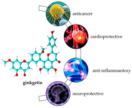 Due to its anti-inflammatory effects, in vitro studies have shown that ginkgetin can be used in the treatment of inflammation-related diseases such as airway inflammation [56] and diabetic nephropathy [57]. It may also be useful as an antiviral [32], antibacterial [30] and antiparasitic [58] agent and has gained attention in recent years as a target for the treatment of SARS-CoV-2 infection [59,60,61].