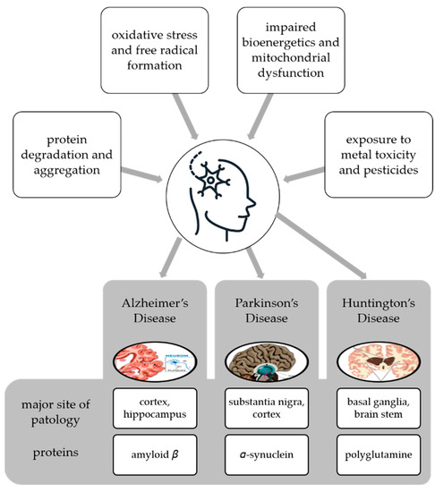 Neurodegenerative disease is a general term for several diseases mainly characterized by a progressive loss of structure or function of neurons that worsens over time [62]. They can be genetic or caused by a tumor, stroke, toxins, viruses, etc., and affect millions of people around the world. Neurodegenerative disorders are caused by various conditions such as abnormal protein dynamics with defective protein aggregation and degradation and aggregation, impaired bioenergetics and mitochondrial dysfunction, excessive free radical formation leading tooxidative stress, and exposure to environntal toxicants such as heavy metals and pesticides [63] (Figure 3).
