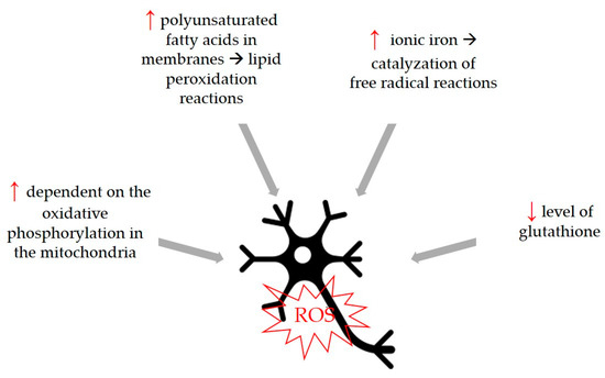 Oxidative stress is a common trigger that can be associated with the development of neurodegenerative diseases, so compounds with antioxidant activity can be considered beneficial for the development of these diseases. Although the physiological cause of aging is not fully known, the free radical theory states that increasing oxidative stress of aging and aging-related diseases plays a fundamental role in this process by causing cellular degeneration. The increase in the number of free radicals observed in age-related neurodegenerative diseases and the fact that neurons are more sensitive to this damage have both been determined to be important characteristics. Therefore, it is thought that free radical production has an important role in the development and progression of neurological diseases [81]. Neurons are more susceptible to free radical damage [82] for certain reasons shown in Figure 4.
