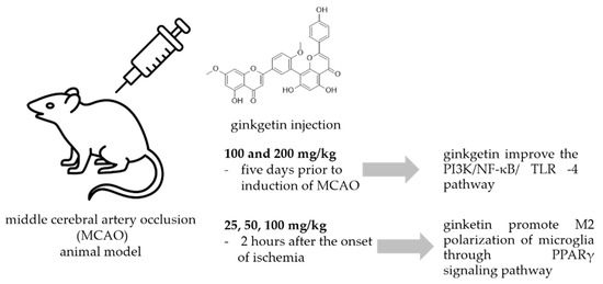 A common method to study the antineuroinflammatory potential of certain molecules is to use animal models exposed to neuronal injury caused by ischemic stroke. Most ischemic strokes occur in the middle cerebral artery territory, so many of the animal models of stroke that have been developed have focused on this artery. In the intraluminal monofilament model of middle cerebral artery occlusion (MCAO), a surgical suture is inserted into the external carotid artery and advanced into the internal carotid artery (ICA) until the tip occludes the origin of the MCA, resulting in interruption of blood flow and subsequent cerebral infarction in the MCA area [89]. This model has been used also for the study of the effects of ginkgetin (Figure 5.).