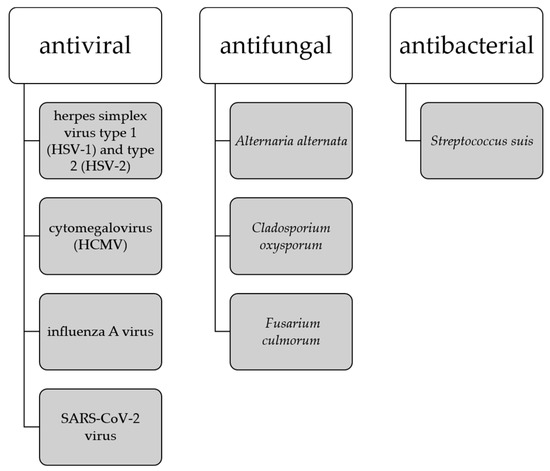 It has been noted that the development of amyloid-β plaques occurs about 10–20 years before the manifestation of AD symptoms, thus the earlier interventions are necessary to address presymptomatic AD. Studies suggesting that amyloid-β peptides may play a role in innate immunity as antimicrobial peptides indicate that the buildup of amyloid-β plaques may be a response to the presence of viruses and bacteria [94]. This has led to the establishment of the antimicrobial hypothesis for AD and the use of antimicrobial and antiviral drugs as potential therapeutics targeting the root cause of AD. Biflavonoids are in the focus of the sciences as a potent antimicrobial, expecially antiviral agents [13,94] where ginkgetin stands out as a compound with antiviral capabilities against herpes simplex virus type 1 (HSV-1) and type 2 (HSV-2) [25], cytomegalovirus (HCMV) [25], influenza A virus [32], and SARS-CoV-2 virus [59,60,102]. Ginkgetin also shows antifungal activity against Alternaria alternate, Cladosporium oxysporum, and Fusarium culmorum [35], and antibacterial activity against Streptococcus suis [103] (Figure 6).