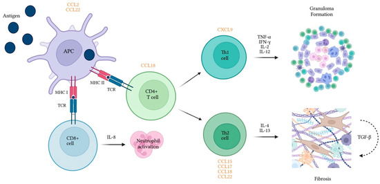 Cytokines and chemokines released by immune cells play a role in inflammatory and fibrotic processes associated with hypersensitivity pneumonitis. Chemokines are presented in orange in proximity to the cell type they recruit. APC—Antigen presenting cell; CCL—Chemokine ligand; CD—Cluster of differentiation; CXCL—Keratinocyte-derived cytokine ligand; IFN-γ—Interferon gamma; IL—interleukin; MHC—Major histocompatibility complex; TCR—T-cell receptor; TGF-β—Tumor growth factor beta; TNF-α—Tumor necrosis factor alpha.