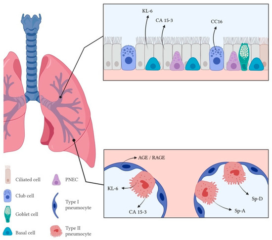 Sampling the alveolar milieu with bronchoalveolar lavage (BAL) may be indicated in ILDs, not only to study microbiological agents and cell populations [40], but also cell markers, soluble mediators (e.g., proteins secreted by the epithelium). On the other hand, significant deviations in the serum levels of some molecules may occur due to local overproduction and increased permeability and/or destruction of the air-blood barrier in the diseased lung [41,42,43]. This led to their potential use as serum biomarkers with diverse purposes [44].