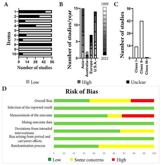 The quality assessment and risk of bias of the included articles. (A) The quality assessment was made taking into consideration 10 possible items. Just 1 article (1 of 56), had an unclear quality, while all the remaining articles had at least 2 quality concerns. (B) The majority of the included studies came from Asia, followed by the USA and Europe. Within the included articles. (C) The median quality score of included studies was 6 (range, 3–8). (D) From all the included studies, 35.7% of the articles were evaluated as having a low bias risk, 41.1% were found to have some bias concerns, and 23.2% had a high risk of bias.