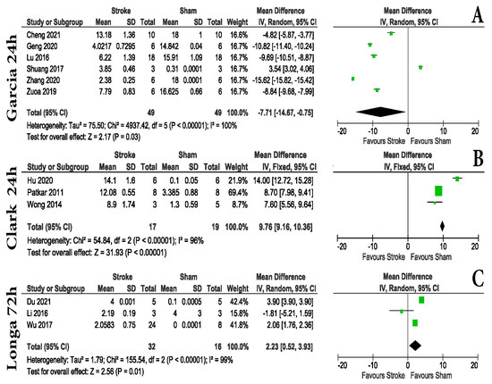 Neurological scores in the hyper-acute stroke phase. Within the first 24 h post-stroke, both (A) Garcia [19,20,21,22,23,44] (MD = −7.71 with a 95% confidence interval (CI) of −14.67 to −0.75, p = 0.03, and (B) Clark [25,27,50] (MD = 9.76 with a 95% CI of 9.16 to 10.36, p < 0.00001) scoring systems can distinguish between MCAo and Sham animals. (C) At the end of the hyper-acute post-stroke interval, Longa [13,18,57] scoring was also able to distinguish between groups (MD = 2.23 with a 95% CI of 0.52 to 3.93, p = 0.01).